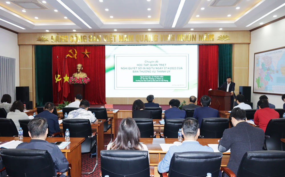 Sáng 26/2, Đảng ủy Khu kinh tế Hải Phòng tổ chức Hội nghị học tập, quán triệt một Nghị quyết số 06-NQ/TU ngày 7/4/2022 của Ban Thường vụ Thành ủy “về nhiệm vụ và giải pháp chủ yếu đẩy mạnh công tác quản lý, phát triển các khu công nghiệp, cụm công nghiệp trên địa bàn thành phố Hải Phòng đến năm 2025, định hướng đến năm 2030”.