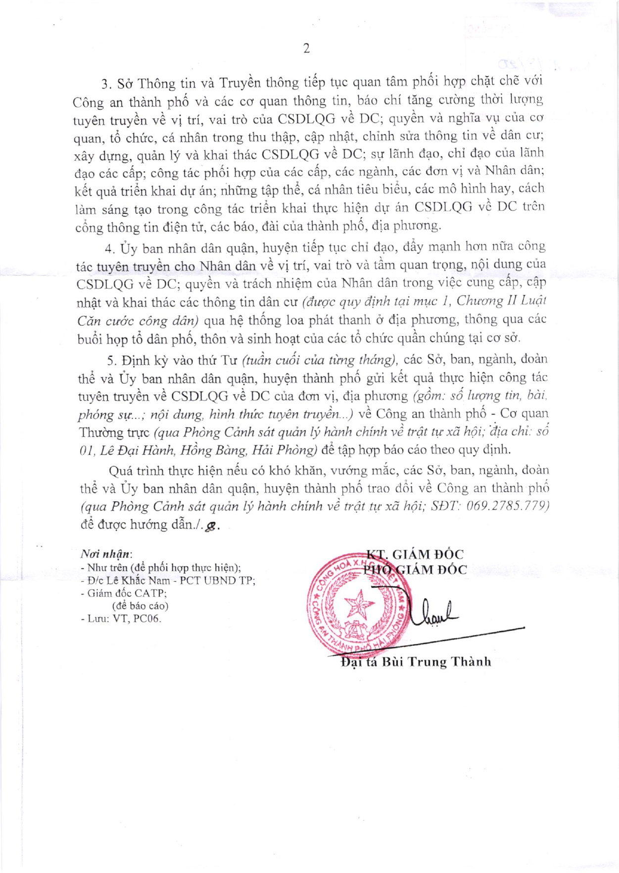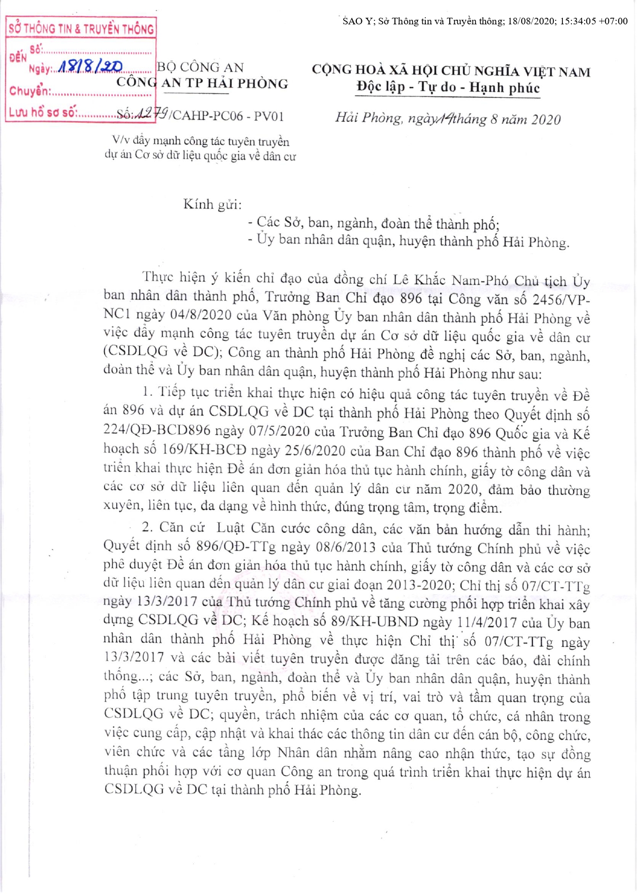 Thực hiện ý kiến chỉ đạo tại Công văn số 2456/VP-NC1 ngày 04/8/2020 của Văn phòng Ủy ban nhân dân thành phố Hải Phòng về việc đẩy mạnh công tác tuyên truyền dự án Cơ sở dữ liệu quốc gia về dân cư (CSDLQG về DC); Công an thành phố Hải Phòng đã ban hành văn bản số 1279/CAHP-PC06-PV01 ngày 14/8/2020 đề nghị các Sở, ban, ngành, đoàn thể và Ủy ban nhân dân quận, huyện thành phố Hải Phòng triển khai một số nhiệm vụ cụ thể.