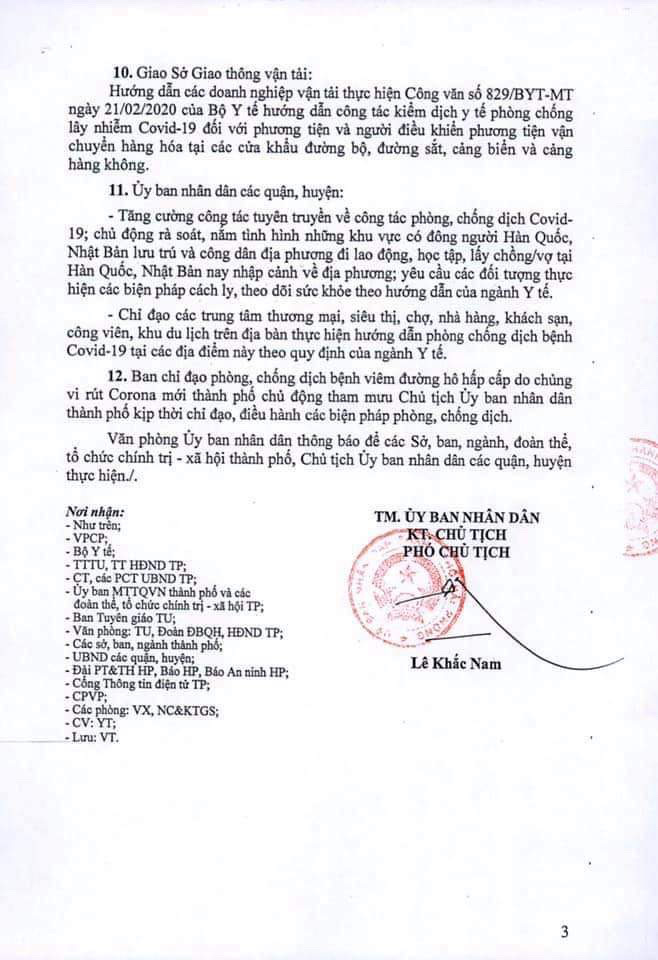 1. Yêu cầu các Sở, ban, ngành, UBND các quận, huyện, các đoàn thể, tổ chức chính trị – xã hội thành phố tiếp tục thực hiện nghiêm các giải pháp phòng, chống dịch theo đúng chỉ đạo của Thủ tướng Chính phủ tại: Chỉ thị số 05/CT-TTg ngày 28/1/2020, Chỉ thị số 06/CT-TTg ngày 31/1/2020; các Văn bản của Bộ, ngành Trung ương; chỉ đạo của Chủ tịch UBND thành phố tại: Chỉ thị số 03/CT-UBND ngày 24/1/2020, Chỉ thị số 04/CT-UBND ngày 3/2/2020, Thông báo số 96/TB-UBND ngày 24/2/2020 và các văn bản chỉ đạo khác; đề cao cảnh giác, không được lơ là, chủ quan, phải coi công tác “chống dịch như chống giặc”, kiên quyết ngăn chặn dịch Covid-19, không để xảy ra trên địa bàn thành phố.