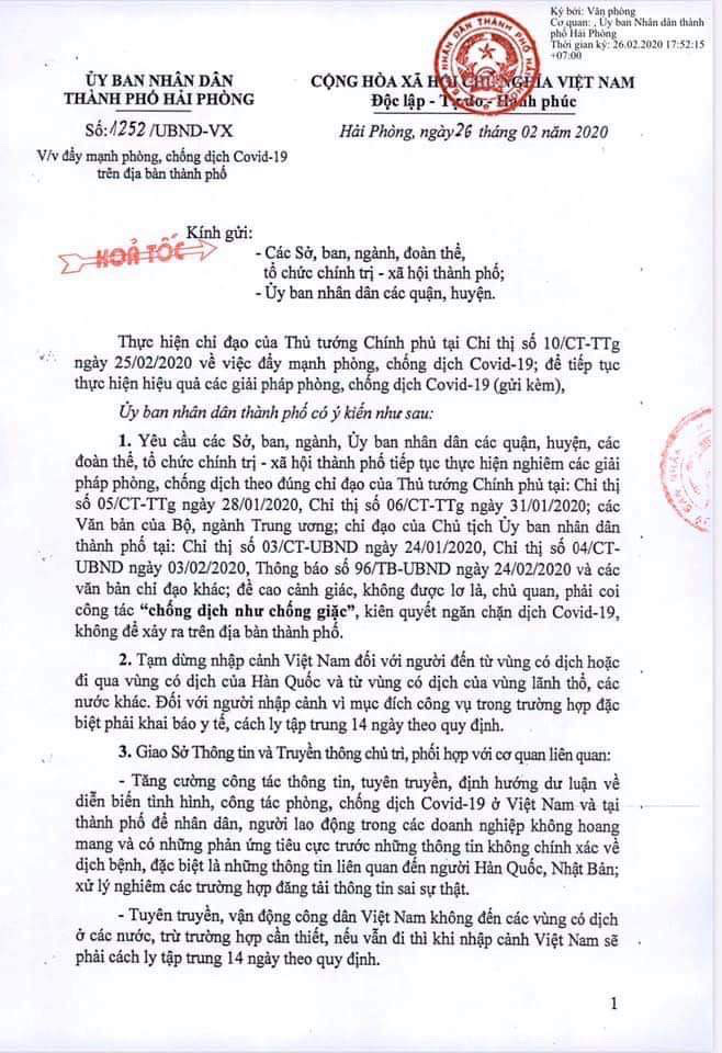 UBND thành phố Hải Phòng vừa ra văn bản số 1252/UBND-VX gửi các sở, ban, ngành, đoàn thể, tổ chức chính trị – xã hội; UBND các quận, huyện về đẩy mạnh phòng, chống dịch Covid-19 trên địa bàn thành phố.