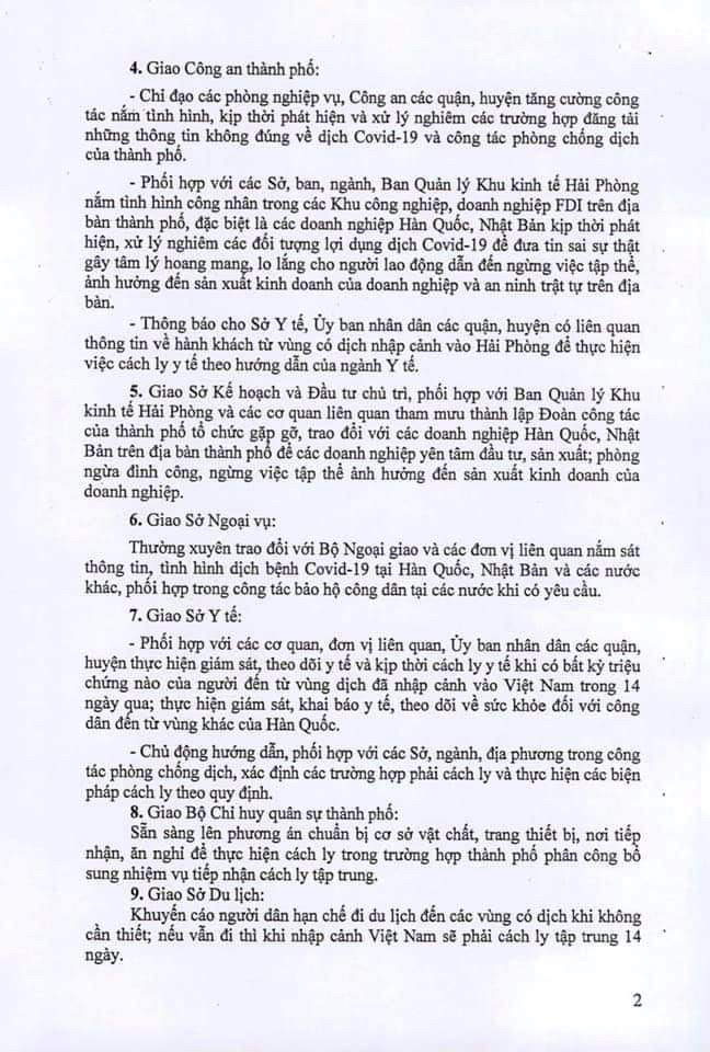 2. Tạm dừng nhập cảnh Việt Nam đối với người đến từ vùng có dịch hoặc đi qua vùng có dịch của Hàn Quốc và từ vùng có dịch của vùng lãnh thổ, các nước khác. Đối với người nhập cảnh vì mục đích công vụ trong trường hợp đặc biệt phải khai báo y tế, cách ly tập trung 14 ngày theo quy định.