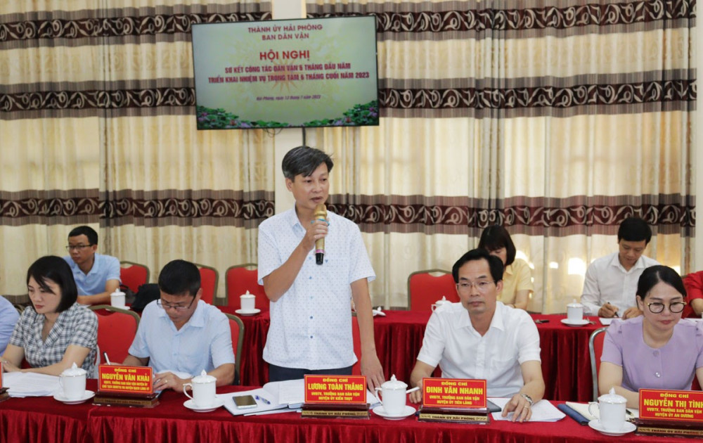 Ban Dận vận Thành ủy cũng làm tốt vai trò cơ quan thường trực các Ban Chỉ đạo: Quy chế dân chủ ở cơ sở, Tôn giáo-Dân tộc của cấp ủy và Xây dựng giai cấp công nhân Hải Phòng; tập trung đôn đốc đẩy nhanh tiến độ lập hồ sơ đăng ký đất đai, cấp giấy chứng nhận quyền sử dụng đất cho các cơ sở tôn giáo trên địa bàn huyện Thủy Nguyên, Kiến Thụy; hướng dẫn các hoạt động tín ngưỡng, tôn giáo theo quy định của pháp luật; tham mưu chỉ đạo, xử lý các vụ việc tín ngưỡng, tôn giáo phát sinh. Ký kết, triển khai kế hoạch phối hợp công tác dân vận với các cơ quan, đơn vị. Tăng cường công tác nắm bắt tình hình, tuyên truyền, vận động Nhân dân trong công tác giải phóng mặt bằng, xây dựng nông thôn mới kiểu mẫu, chỉnh trang, hiện đại hóa đô thị, thực hiện chuyển đổi số…