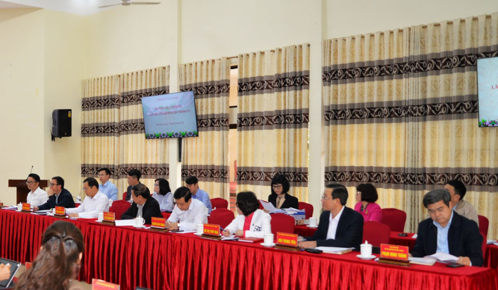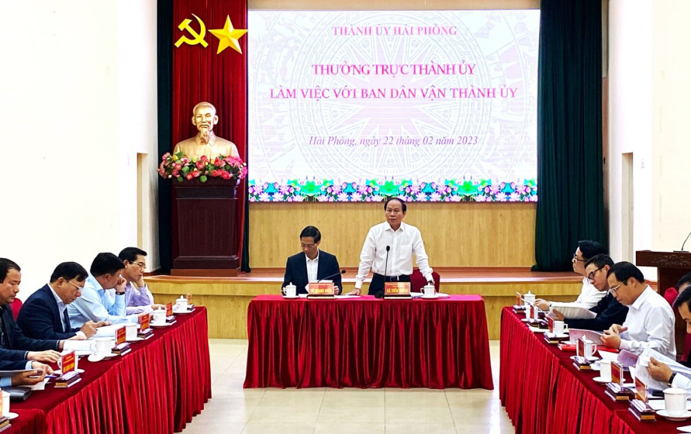 Phát biểu kết luận cuộc làm việc, đồng chí Lê Tiến Châu, Ủy viên Trung ương Đảng, Bí thư Thành ủy ghi nhận, đánh giá cao những kết quả của Ban Dân vận Thành ủy đạt được từ đầu nhiệm kỳ 2020-2025 đến nay; đã tập trung đổi mới, nâng cao chất lượng công tác tham mưu, đề xuất với Thường trực Thành ủy, Ban Thường vụ Thành ủy, Thành ủy lãnh đạo, chỉ đạo công tác dân vận theo hướng cụ thể, lượng hóa, hướng mạnh về cơ sở, có trọng tâm, trọng điểm, bám sát các nhiệm vụ chính trị của thành phố. Làm tốt vai trò của cơ quan thường trực của 3 Ban Chỉ đạo: Công tác Tôn giáo-Dân tộc của Thành ủy; Xây dựng và thực hiện Quy chế dân chủ thành phố; Xây dựng giai cấp công nhân Hải Phòng. Tham mưu chỉ đạo, đôn đốc giải quyết tốt các vấn đề là điểm nghẽn trong công tác tín ngưỡng, tôn giáo. Tăng cường nghiên cứu, tổng kết từ thực tiễn và chủ động tham mưu, đề xuất với Thường trực Thành ủy, Ban Thường vụ Thành ủy lãnh đạo, chỉ đạo công tác dân vận; chủ động triển khai các chương trình, kế hoạch phối hợp thực hiện công tác dân vận đảm bảo rõ người, rõ việc, thiết thực, có hiệu quả. Chú trọng ứng dụng công nghệ thông tin vào thực hiện công tác dân vận.