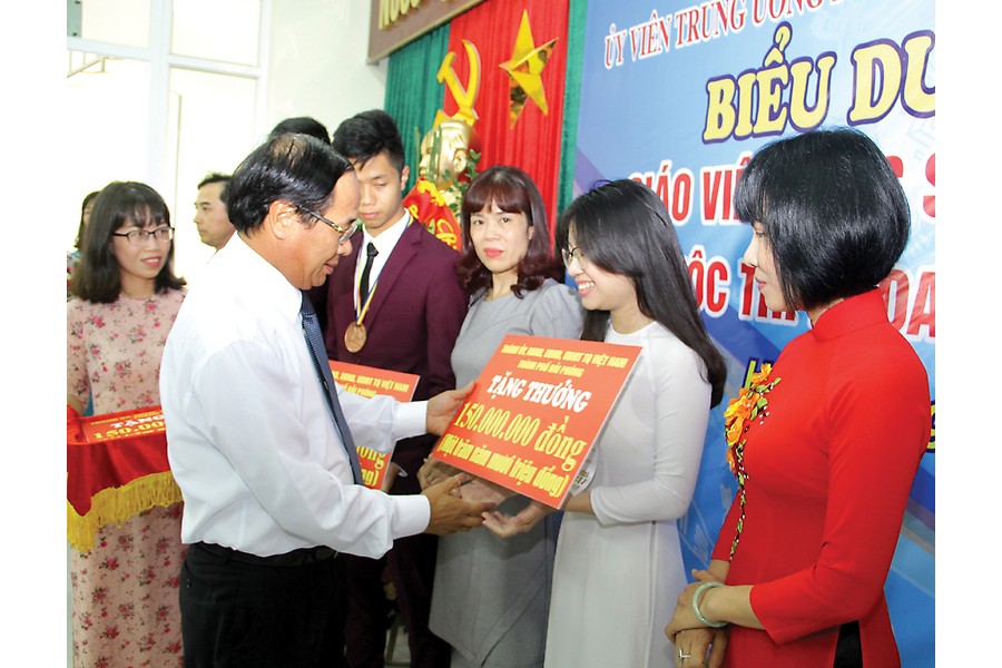 Đồng chí Lê Văn Thành, Ủy viên Trung ương Đảng, Bí thư Thành ủy, Chủ tịch HĐND thành phố trao thưởng cho học sinh đạt giải Quốc tế năm 2018.