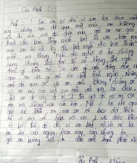 Khi lực lượng Công an có mặt xác định trong chiếc túi có một điện thoại iphone, 2 lá thư tuyệt mệnh viết tay gửi cho người yêu và cho bố mẹ.