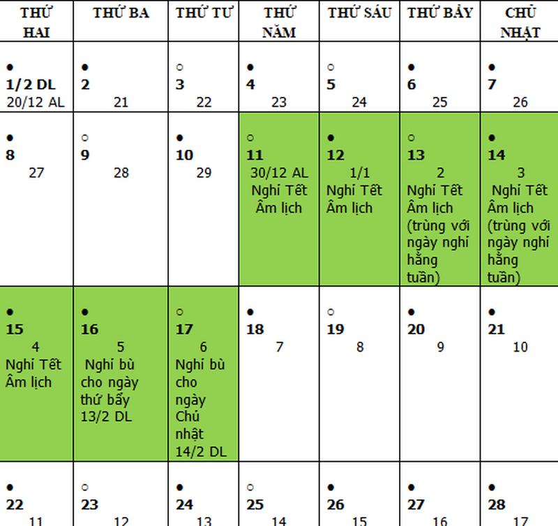 Phương án 2: Công chức, viên chức nghỉ Tết Nguyên đán là 7 ngày liên tục. Do ngày mùng 2 và mùng 3 Tết Nguyên đán (tức ngày 13-14 tháng 2-2021 dương lịch) trùng vào thứ Bảy và Chủ nhật là ngày nghỉ hằng tuần, công chức, viên chức sẽ nghỉ bù vào ngày mùng 5 và mùng 6 Tết Nguyên đán (tức ngày 16-17 tháng 2-2021 dương lịch).