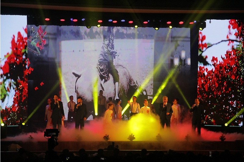 Hai NSND Quang Thọ- Quang Huy, hai NSƯT Dương Minh Đức- Thanh Vinh và tốp múa biểu diễn ca khúc “Hải Phòng tuổi thơ tôi”. Ảnh: Thu Hiền
