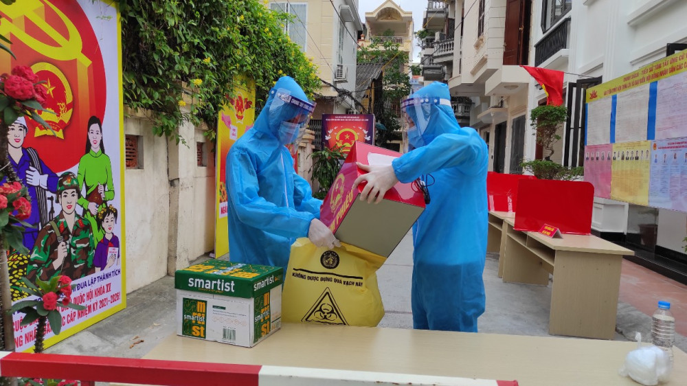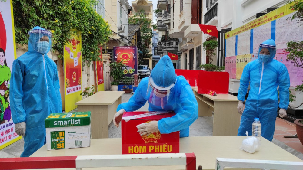 Từ đầu giờ sáng 23/5, thành viên của Tổ bầu cử số 2 được trang bị đầy đủ quần áo bảo hộ chống dịch và lực lượng y tế mang hòm phiếu đã được niêm phong, khử khuẩn vào đặt tại bàn của điểm bầu cử trong khu phong tỏa.
