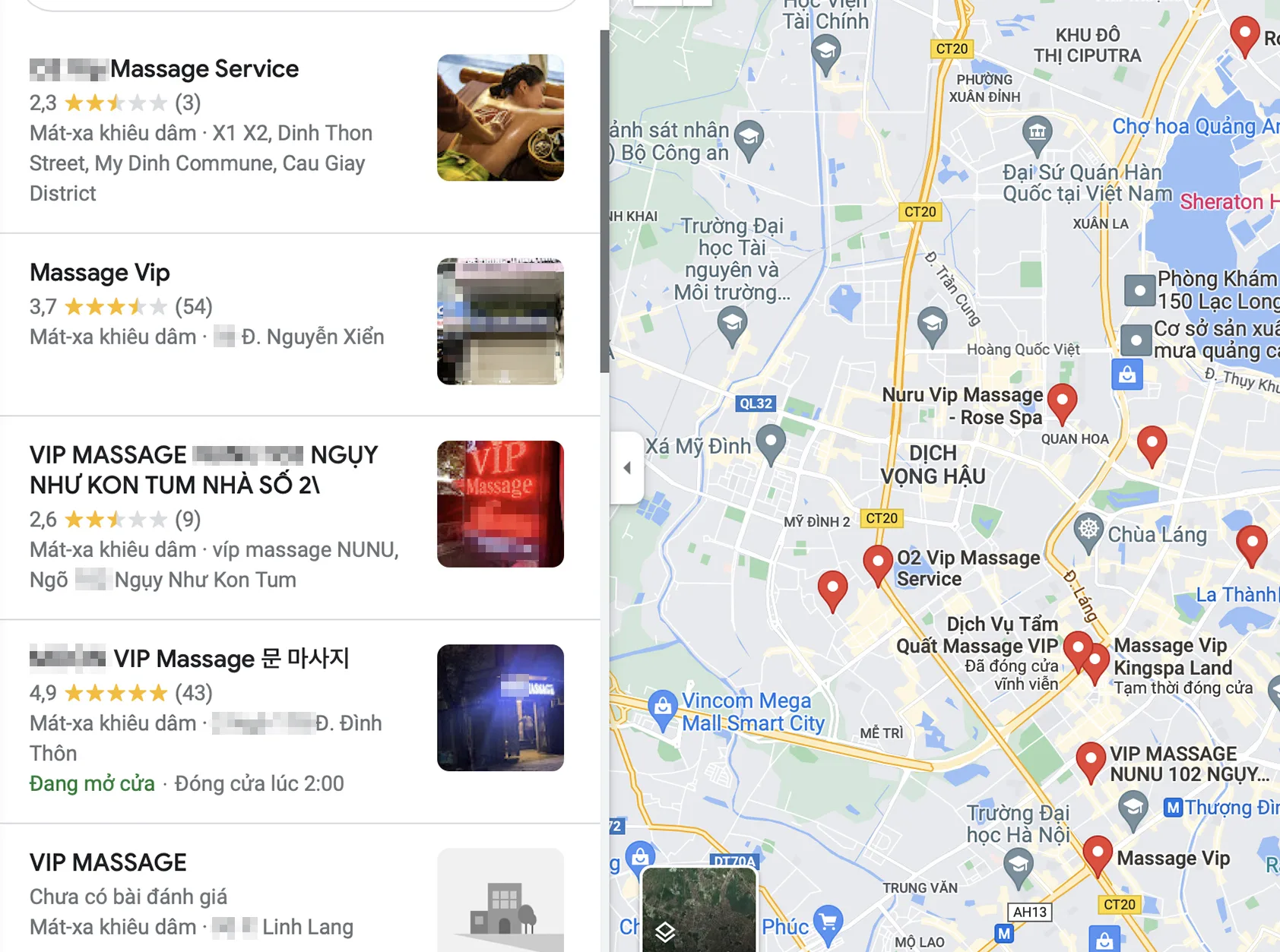 Tìm hiểu của Lao Động trong ngày 2.10 cho thấy, hàng loạt dịch vụ nhạy cảm cũng được quảng cáo trá hình trên Google Maps. Tại một vị trí giới thiệu là khách sạn tại Âu Cơ (Tây Hồ, Hà Nội) được gắn thẻ thông tin là “mát-xa khiêu dâm” kèm theo đó là các hình ảnh và số điện thoại. Người dùng nếu click vào thẻ thông tin này sẽ được đề xuất thêm nhiều địa điểm khác có dịch vụ tương tự.