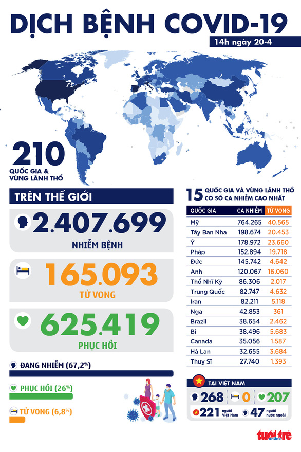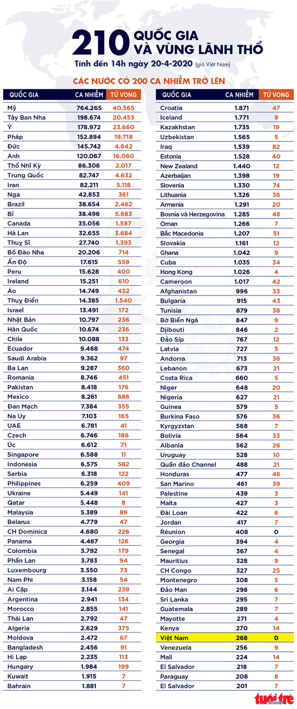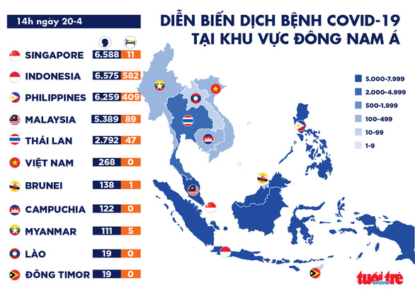 Thái Lan ngày 20-4 báo cáo không có ca tử vong mới nào, chỉ có thêm 27 ca nhiễm mới. Trong khi Singapore xác nhận số ca nhiễm virus corona tăng kỉ lục 1.426 ca mới, vẫn nhiều nhất Đông Nam Á.