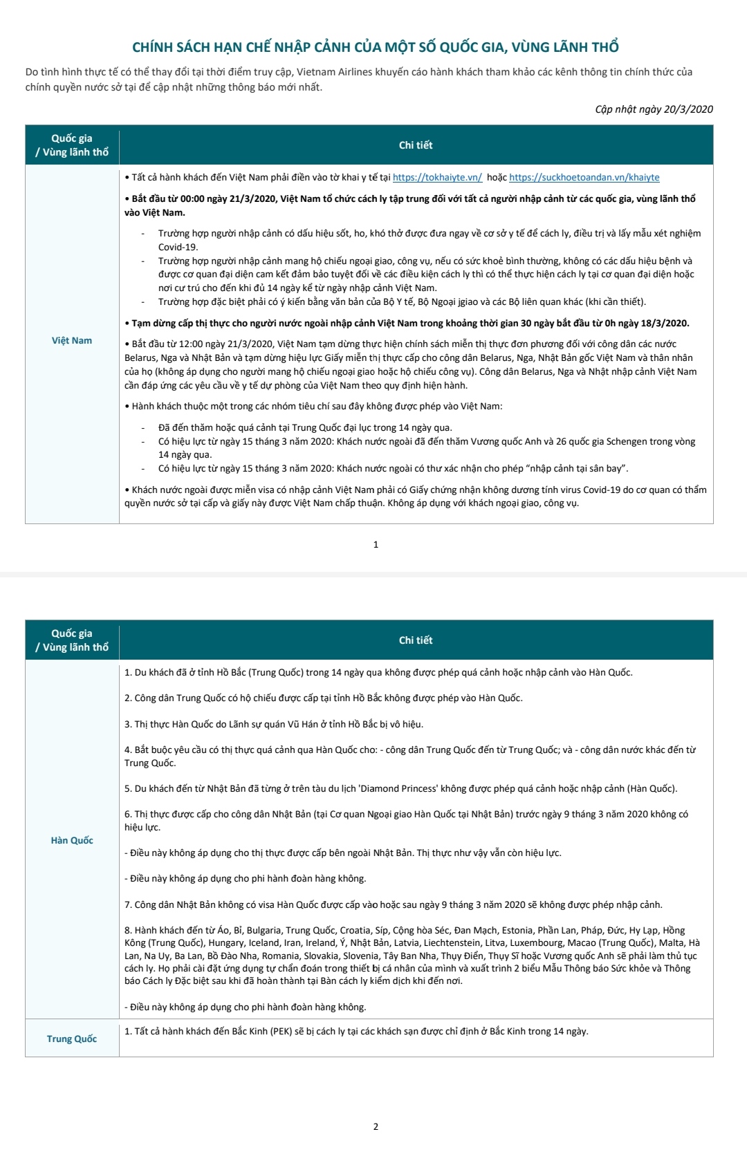 Do tình hình thực tế có thể thay đổi tại thời điểm truy cập, Vietnam Airlines khuyến cáo hành khách tham khảo các kênh thông tin chính thức của chính quyền nước sở tại để cập nhật những thông báo mới nhất.