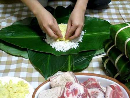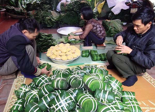 Cả một khoảng sân rộng lớn chứa đầy nguyên liệu phục vụ cho việc làm bánh. Dưới bàn tay khéo léo, thuần thục của những người thợ, những xấp lá dong xanh rờn, thúng gạo nếp trắng phau, đỗ xanh vàng tươi và những thau thịt được ướp gia vị thơm lừng cứ dần vơi đi để thành hình những hàng bánh đẹp đẽ, vuông vức và đều tăm tắp.