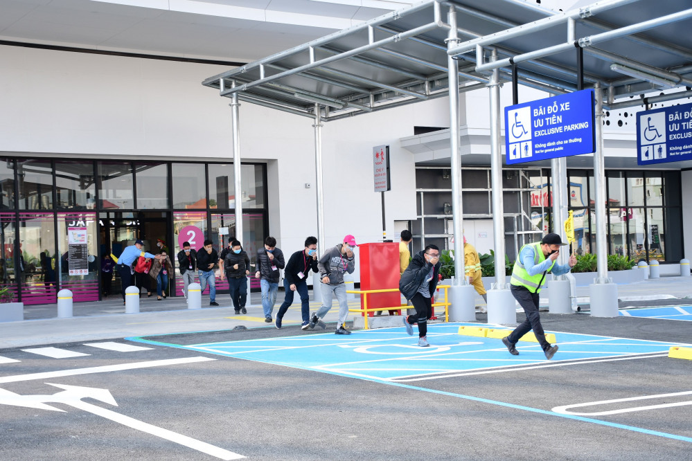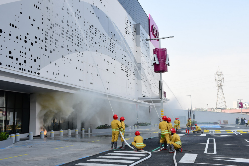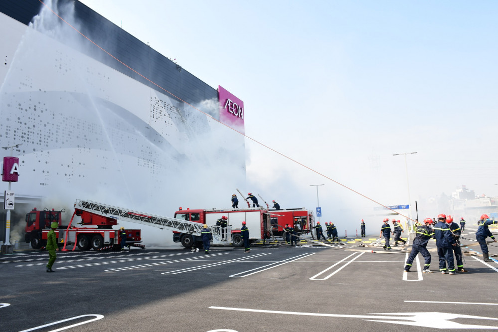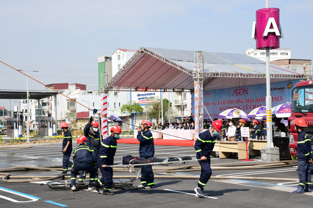 Lực lượng phòng cháy, chữa cháy Trung tâm thương mại Aeon Mall Lê Chân-Hải Phòng triển khai đội hình, phương tiện ứng phó sự cố cháy ngay khi có tín hiệu báo cháy.