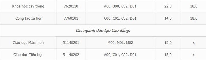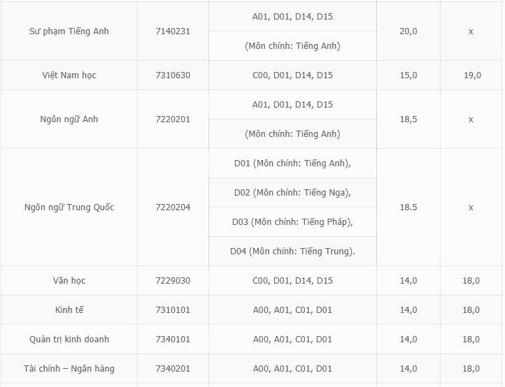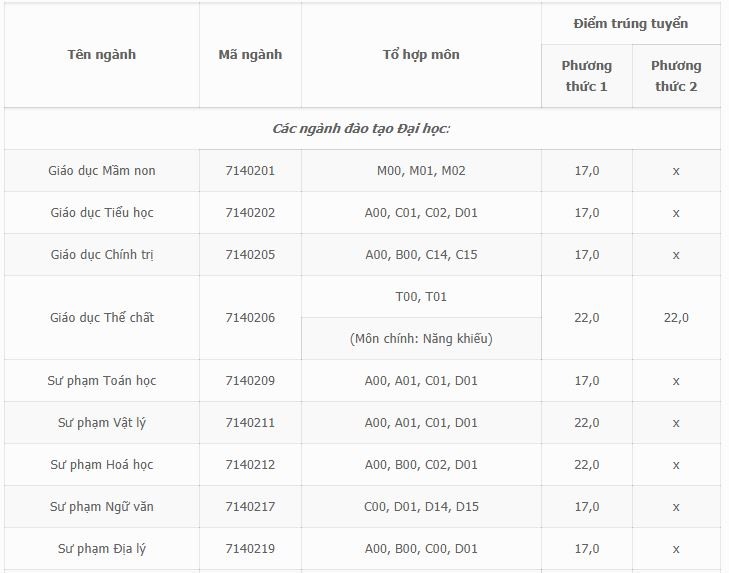 Các ngành Giáo dục thể chất, Sư phạm Vật lý, Sư phạm Hóa học có điểm chuẩn ở ngưỡng 22 điểm. Ngành Sư phạm Tiếng Anh lấy 20 điểm, nhiều ngành khác lấy mức điểm 14.