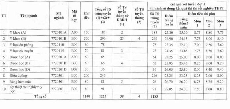 Ngành Y Khoa (B) có điểm chuẩn trúng tuyển cao nhất (26,9 điểm), theo sau đó là khoa Răng hàm mặt với 26,7 điểm. Khoa Y học dự phòng có điểm chuẩn thấp nhất trường, 22,35 điểm.