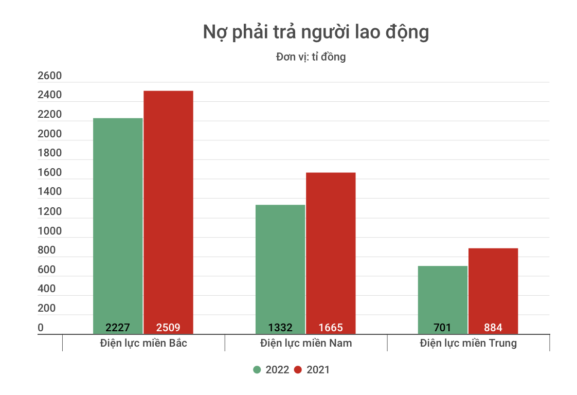 Trong đó, bức tranh tài chính của Điện lực miền Bắc đang có nhiều điểm đáng chú ý. Bởi bên cạnh kết quả kinh doanh đi lùi, doanh nghiệp này còn gây bất ngờ với khoản mục phải trả người lao động vượt ngưỡng 2.200 tỉ đồng, cao hơn nhiều so với EVNCPC và EVNSPC.