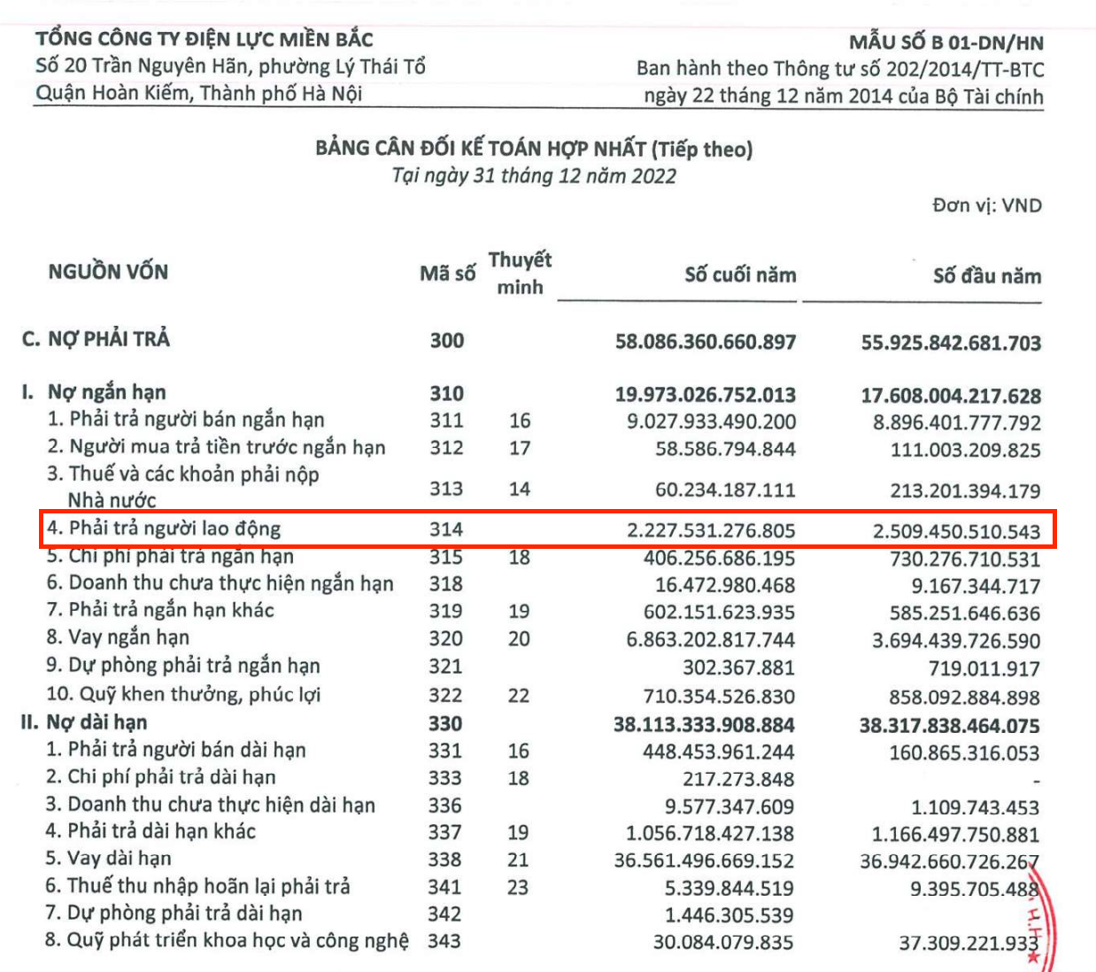 Tại ngày 31.12.2022, nợ phải trả của Tổng Công ty Điện lực miền Bắc còn hơn 58.086 tỉ đồng, trong đó đáng chú ý khi khoản mục phải trả người lao động vượt mức 2.200 tỉ đồng.
