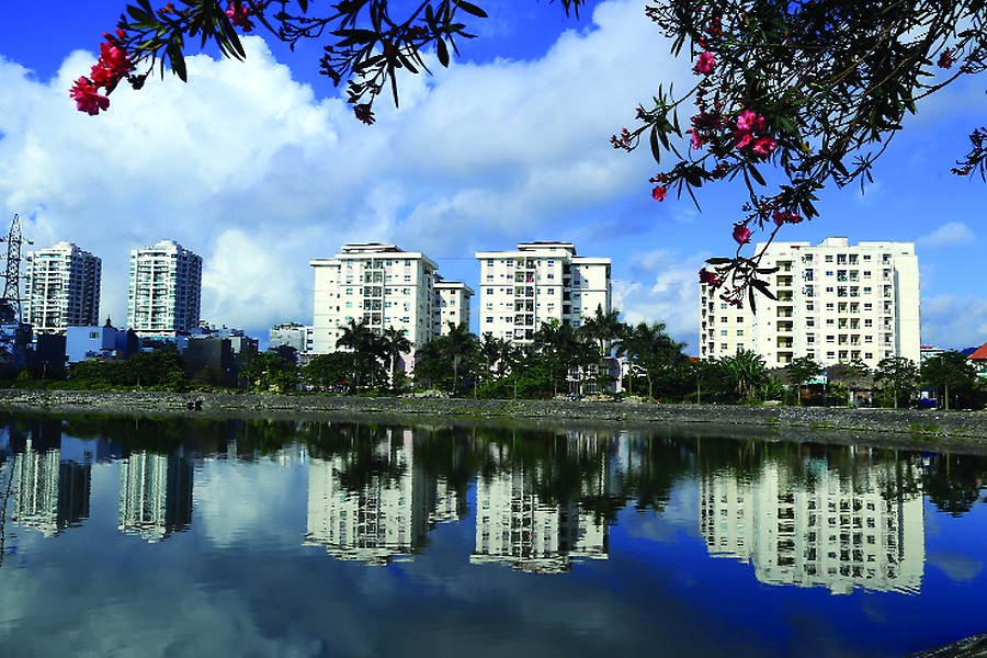 Khu chung cư mới được xây dựng soi bóng bên hồ Phương Lưu. Ảnh: Duy Thính