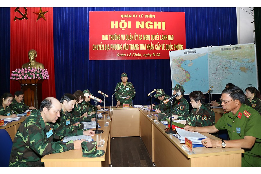 Họp hội nghị Ban Thường vụ Quận ủy ra nghị quyết lãnh đạo chuyển địa phương vào trạng thái khẩn cấp về quốc phòng tại Diễn tập khu vực phòng thủ quận Lê Chân năm 2018.