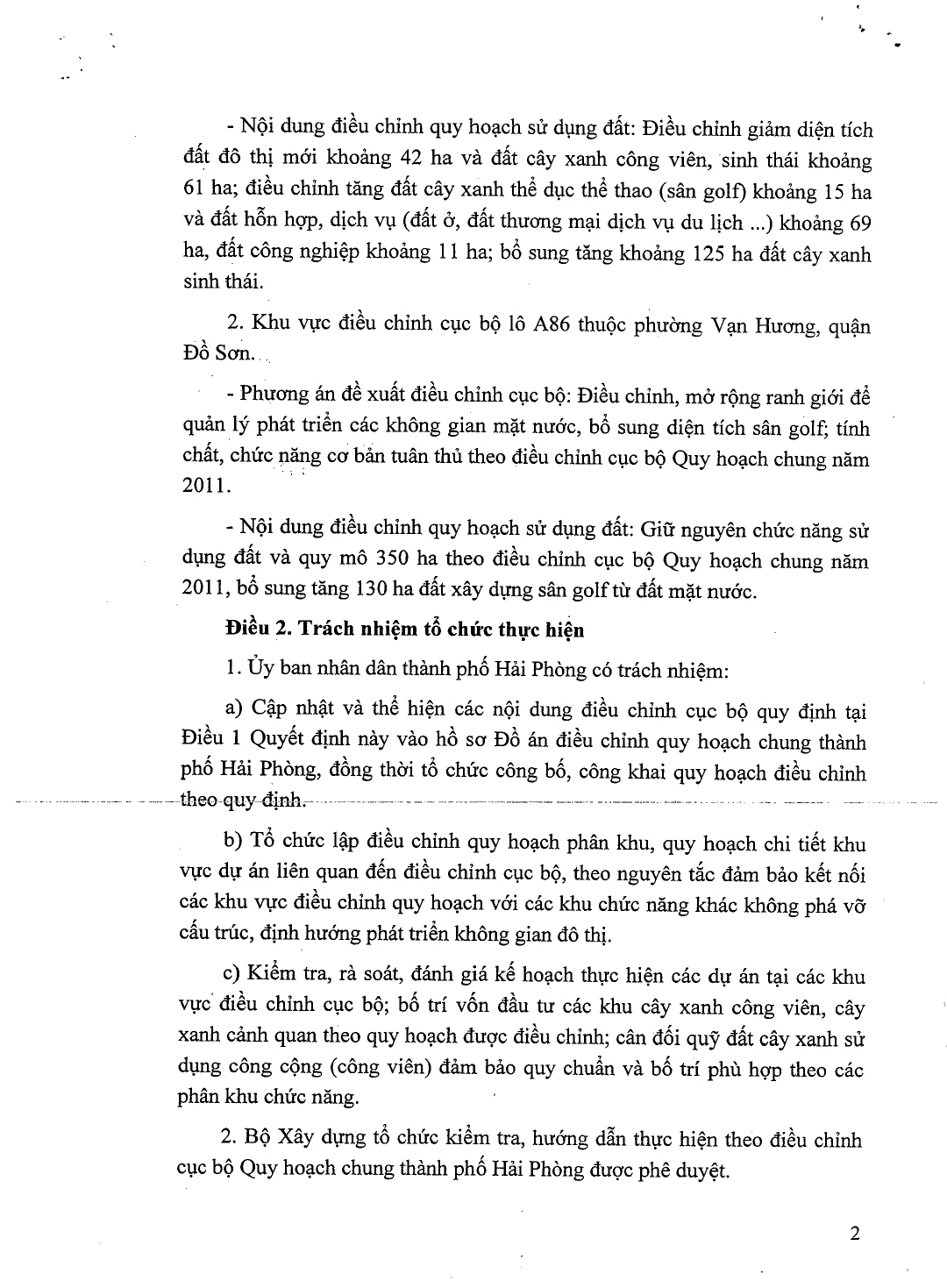 Đối với khu vực điều chỉnh cục bộ lộ A86 thuộc phường Vạn Hương, quận Đồ Sơn. Phương án đề xuất điều chỉnh cục bộ: Điều chỉnh, mở rộng ranh giới để quản lý phát triển các không gian mặt nước, bổ sung diện tích sân golf; tính chất, chức năng cơ bản tuân thủ theo điều chỉnh cục bộ Quy hoạch chung năm 2011.