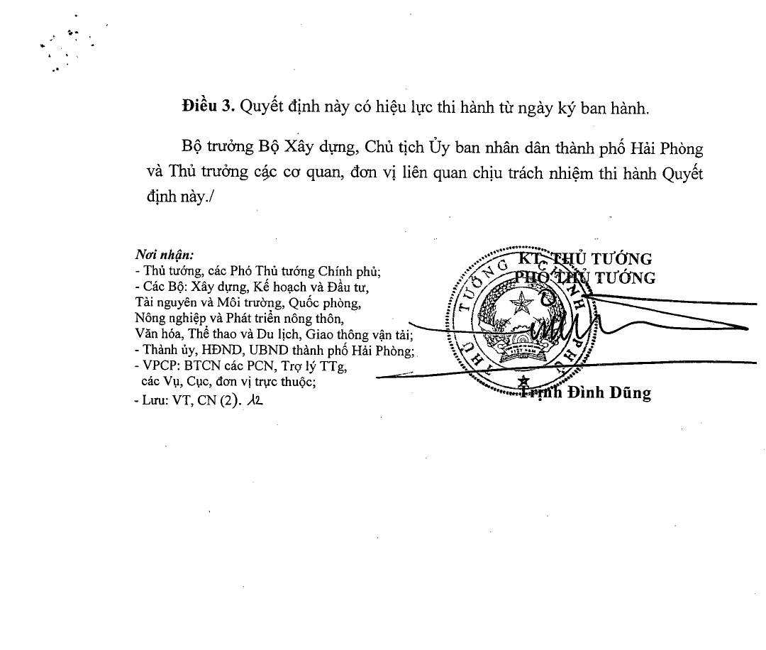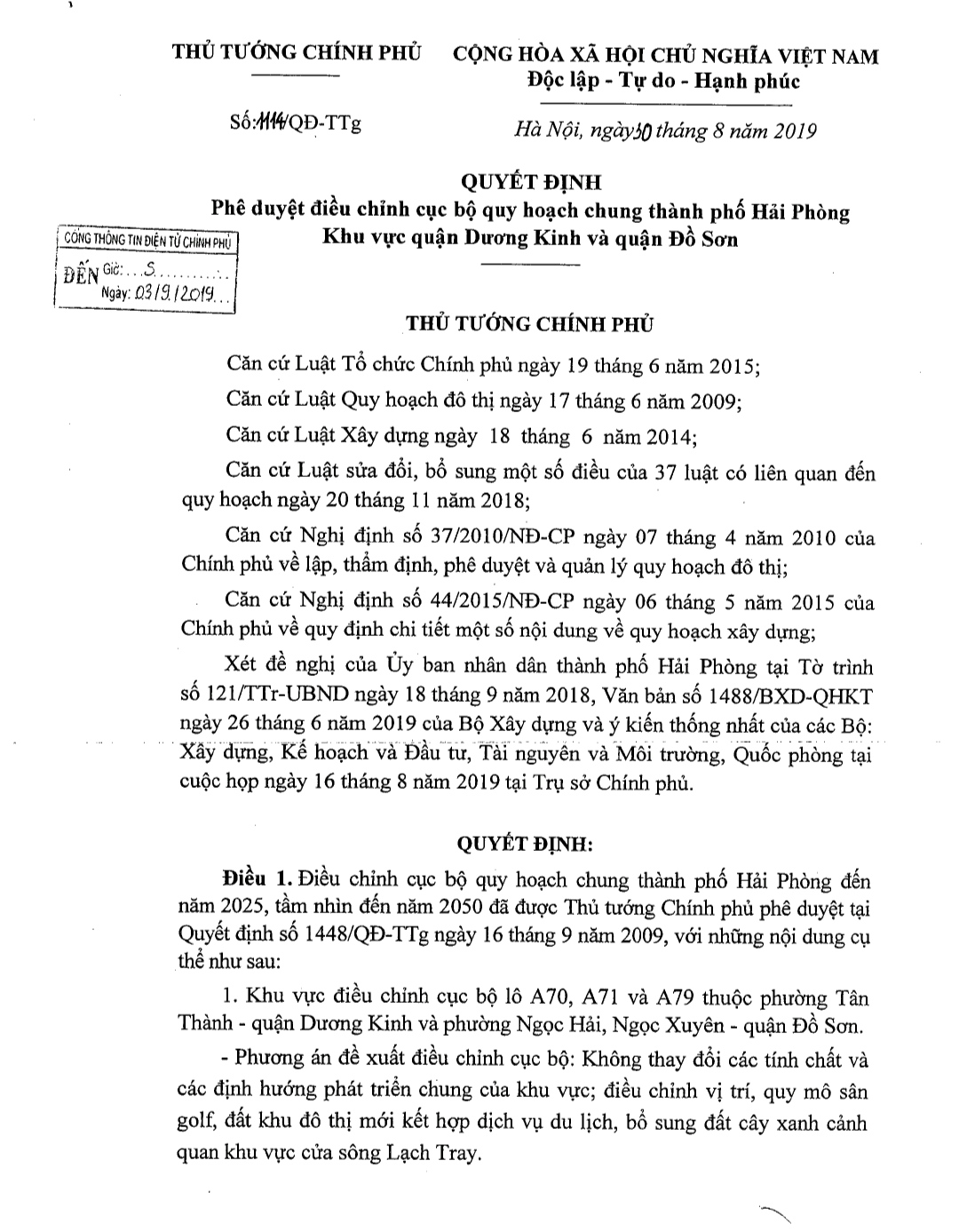 Ngày 30/8/2019, Thủ tướng Chính phủ đã ban hành Quyết định số 1114/QĐ-TTg phê duyệt điều chỉnh cục bộ quy hoạch chung thành phố Hải Phòng Khu vực quận Dương Kinh và quận Đồ Sơn.