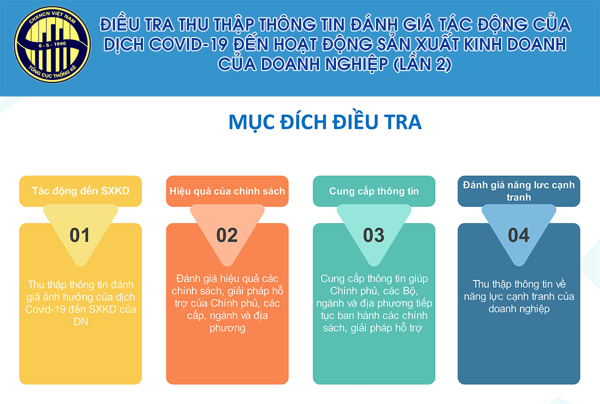 Thực hiện Chỉ thị số 11/CT-TTg ngày 04/3/2020 của Thủ tướng Chính phủ về các nhiệm vụ, giải pháp cấp bách tháo gỡ khó khăn cho sản xuất kinh doanh, bảo đảm an sinh xã hội ứng phó với dịch Covid-19, Tổng cục Thống kê thực hiện khảo sát nhanh nhằm thu thập thông tin đánh giá tác động của dịch Covid-19 đến hoạt động sản xuất kinh doanh của doanh nghiệp, đồng thời đánh giá hiệu quả của các chính sách hỗ trợ của Chính phủ.
