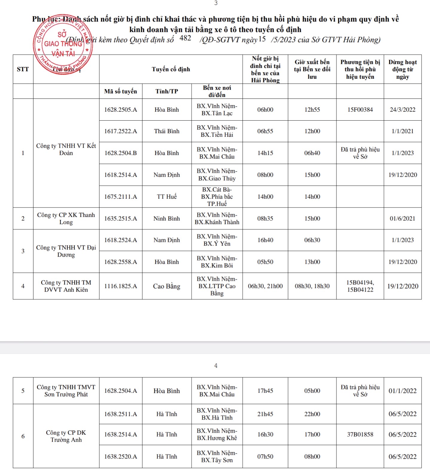 Sở Giao thông Vận tải thành phố vừa có Quyết định 482/QĐ-SGTVT về đình chỉ khai thác tuyến và thu hồi phù hiệu xe của 06 đơn vị do không hoạt động kinh doanh vận tải trên tuyến vận tải khách theo tuyến cố định trong thời gian 60 ngày liên tục.
