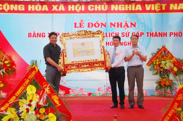 Đồng chí Bùi Quang Hải, Bí thư Quận ủy Dương Kinh, thừa ủy quyền của UBND thành phố trao bằng xếp hạng Di tích lịch sử tới Tổ quản lý di tích phường Hòa Nghĩa.