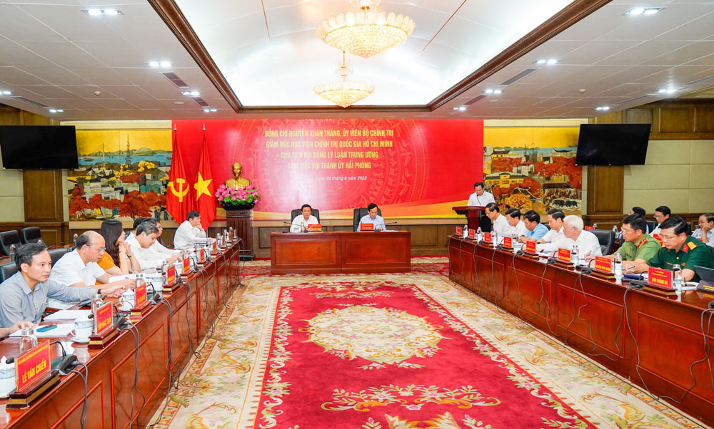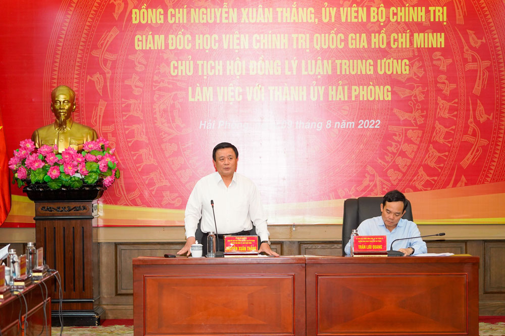 Phát biểu tại cuộc làm việc, đồng chí Nguyễn Xuân Thắng, Ủy viên Bộ Chính trị, Giám đốc Học viện Chính trị quốc gia Hồ Chí Minh nhấn mạnh, đây là lần đầu tiên Học viện Chính trị quốc gia Hồ Chí Minh làm việc với Thành ủy Hải Phòng về công tác cán bộ. Đồng chí ghi nhận và đánh giá cao Thành ủy Hải Phòng luôn quan tâm đến công tác cán bộ; chú ý xây dựng các Đề án làm cơ sở để ban hành Nghị quyết của Thành ủy, chỉ đạo bài bản, khoa học trong việc thực hiện nghiêm các Nghị quyết, Chỉ thị của Trung ương về công tác cán bộ. Đồng chí đề nghị thành phố trong thời gian tới tiếp tục thực hiện tốt quy định của Ban Bí thư về đối tượng, tiêu chuẩn, phân cấp đào tạo lý luận chính trị và Quy chế đào tạo Trung cấp lý luận chính trị của Giám đốc Học viện Chính trị quốc gia Hồ Chí Minh; quan tâm nâng cao chất lượng công tác đào tạo, bồi dưỡng cán bộ; bồi dưỡng thường xuyên đối với cán bộ về kiến thức mới, kỹ năng, nghiệp vụ, rèn luyện kỹ năng; thực hiện kỷ luận, kỷ cương, đặc biệt trong hoạt động giảng dạy, học tập; nâng cao chất lượng đội ngũ cán bộ, giảng viên cơ hữu giảng dạy tại Trường Chính trị Tô Hiệu; đầu tư cơ sở vật chất, trang thiết bị hiện đại trong hoạt động đào tạo, bồi dưỡng cán bộ đáp ứng yêu cầu tình hình mới…