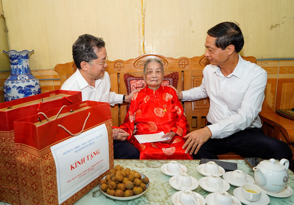 Đến thăm, tặng quà Mẹ Việt Nam anh hùng Ngô Thị Tam, sinh năm 1922, tại số 26/71/31 Đội Văn, phường Trại Chuối, quận Hồng Bàng. Đoàn công tác ân cần thăm hỏi sức khỏe của Mẹ, chúc Mẹ luôn sống vui, khoẻ, tiếp tục dõi theo sự phát triển của thành phố, động viên con cháu phát huy truyền thống gia đình đóng góp xây dựng thành phố ngày càng phát triển.