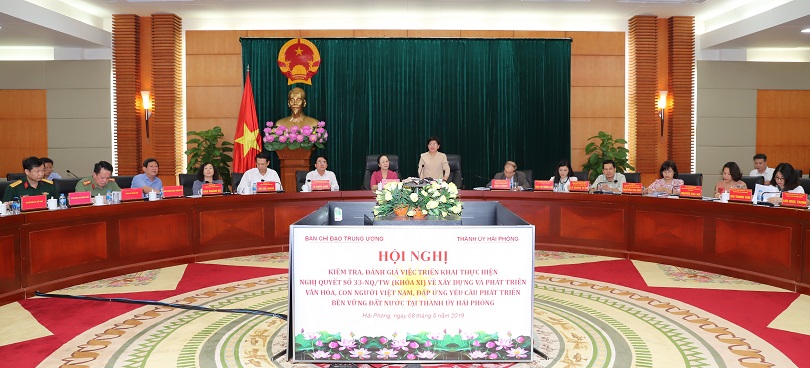 Chiều 8-5, tại Trung tâm hội nghị thành phố, Đoàn kiểm tra của Ban chỉ đạo Trung ương do đồng chí Hoàng Thị Hoa – Phó Chủ nhiệm Ủy ban văn hóa, giáo dục, thanh niên, thiếu niên và nhi đồng của Quốc hội làm Trưởng đoàn, làm việc với Thành ủy Hải Phòng về triển khai thực hiện Nghị quyết số 33-NQ/TW của Ban Chấp hành Trung ương khóa 11 về xây dựng và phát triển văn hóa, con người Việt Nam đáp ứng yêu cầu phát triển bền vững đất nước.
