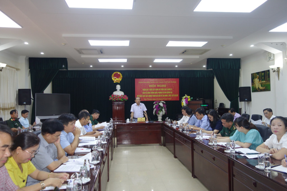 Chuẩn bị Kỳ họp thứ sáu, Quốc hội Khóa XV, sáng 15/9, Đoàn đại biểu Quốc hội thành phố tổ chức Hội nghị tham gia ý kiến xây dựng dự thảo Luật quản lý, bảo vệ công trình quốc phòng và khu quân sự; Dự thảo Luật lực lượng tham gia bảo vệ an ninh, trật tự ở cơ sở. Phó Trưởng Đoàn đại biểu Quốc hộ chuyên trách thành phố Hải Phòng Lã Thanh Tân chủ trì Hội nghị.