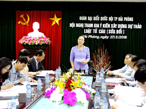 Chiều ngày 27/3/2018, đồng chí Nguyễn Thị Nghĩa, Phó Bí thư Thường trực Thành ủy, Trưởng đoàn Đại biểu Quốc hội Hải Phòng chủ trì hội nghị tham gia ý kiến xây dựng Dự thảo Luật Tố cáo (sửa đổi), cùng dự có Đại biểu Quốc hội Lã Thanh Tân, Giám đốc Sở Tư pháp, đại diện lãnh đạo các Sở, ban, ngành thành phố và các quận huyện.