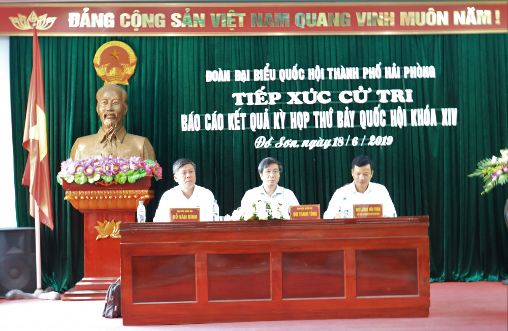 Tại buổi tiếp xúc, đại diện cử tri quận Đồ Sơn cũng đề nghị Quốc hội một số vấn đề như: Không sáp nhập các đơn vị hành chính; quan tâm, có những biện pháp nhằm giảm thiểu mức thấp nhất vấn đề ô nhiễm môi trường đặc biệt là không khí tại địa phương; nghiên cứu, quan tâm đến công tác cán bộ; xây dựng các chế tài để thực thi có hiệu quả các bộ luật.