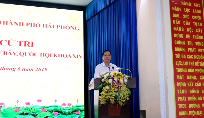 Chiều 18-6, đại biểu Mai Hồng Hải –Tổng giám đốc Công ty Xi măng Vincem Hải Phòng thay mặt đoàn ĐBQH TP HP tiếp xúc cử tri quận Lê Chân, báo cáo kết quả kỳ họp thứ 7, Quốc hội khóa XIV.