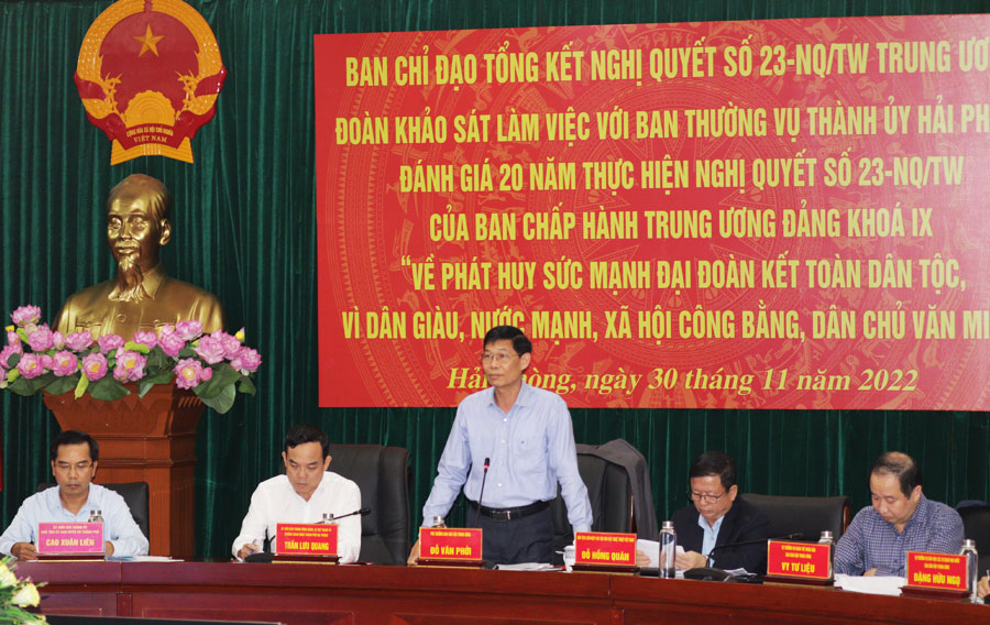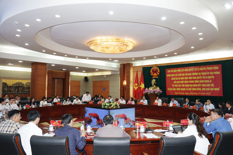 Chiều 30/11, Đoàn khảo sát của Ban Chỉ đạo Trung ương Tổng kết Nghị quyết số 23-NQ/TW do đồng chí Đỗ Văn Phới, Phó Trưởng Ban Dân vận Trung ương làm Trưởng Đoàn làm việc với Ban Thường vụ Thành ủy Hải Phòng đánh giá 20 năm thực hiện Nghị quyết số 23-NQ/TW, ngày 12/3/2003 của Ban Chấp hành Trung ương Đảng khóa IX “về phát huy sức mạnh đại đoàn kết toàn dân tộc, vì dân giàu, nước mạnh, xã hội công bằng, dân chủ, văn minh”.