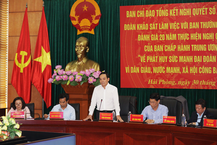 Tại cuộc làm việc, thành phố Hải Phòng đề nghị Ban Chấp hành Trung ương Đảng, Bộ Chính trị, Ban Bí thư chỉ đạo đánh giá, rà soát tổng thể các nghị quyết về từng giai cấp, tầng lớp xã hội, có văn bản bổ khuyết chỉ đạo hoặc ban hành các nghị quyết mới. Đề nghị Quốc hội, Chính phủ chỉ đạo nghiên cứu, sửa đổi và hoàn thiện các chính sách cụ thể đối với giai cấp công nhân, nông dân, trí thức, thanh niên, phụ nữ, đồng bào có đạo, vấn đề dân tộc, tôn giáo… Chỉ đạo Bộ Nội vụ quan tâm hướng dẫn thực hiện đồng bộ, thống nhất bộ máy, cán bộ ở cấp xã, phường, thị trấn; các tổ chức ở thôn, tổ dân phố để góp phần củng cố và phát huy sức mạnh khối đại đoàn kết toàn dân ở cơ sở.