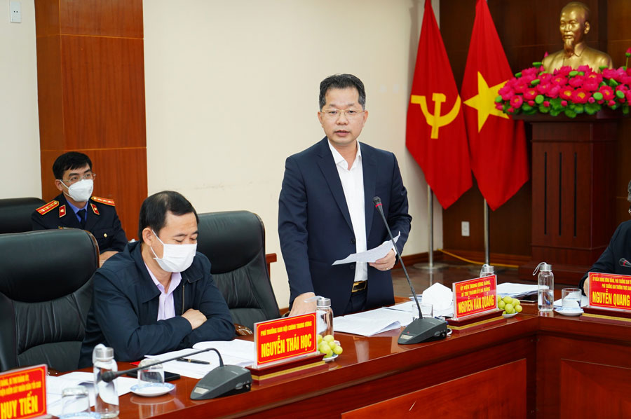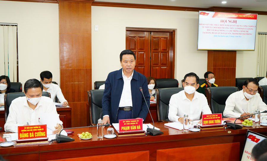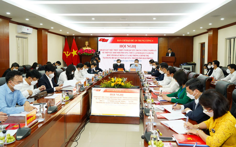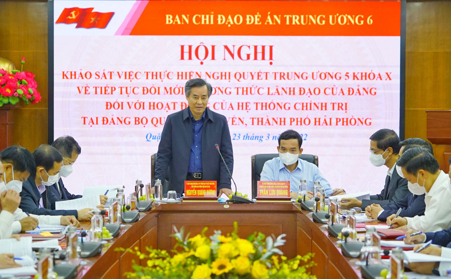 Đồng chí Nguyễn Quang Dương, Phó Trưởng Ban Tổ chức Trung ương, Phó Trưởng Ban Thường trực Ban Chỉ đạo đánh giá cao công tác chuẩn bị của Quận ủy Ngô Quyền trong chuẩn bị các nội dung báo cáo rõ ràng, cụ thể phục vụ cho Đoàn khảo sát. Đồng thời ghi nhận những kết quả đạt được của quận trong việc quán triệt, triển khai thực hiện Nghị quyết Trung ương 5 khóa X về tiếp tục đổi mới phương thức lãnh đạo của Đảng đối với hoạt động của hệ thống chính trị. Quận đã xác định việc học tập quán triệt nghị quyết là nhiệm vụ quan trọng đầu tiên, tạo sự thống nhất trong nhận thức và hành động của cả hệ thống chính trị, là tiền đề thành công trong tổ chức thực hiện; đã xây dựng chương trình hành động thực hiện Nghị quyết Hội nghị Trung ương 5 khóa X, trong đó cụ thể hóa thành 3 mục tiêu, 3 nhóm nhiệm vụ giải pháp thực hiện đổi mới phương thức lãnh đạo của cấp ủy đối với hoạt động của hệ thống chính trị quận. Công tác tuyên truyền, vận động cán bộ, đảng viên và Nhân dân được tiến hành thường xuyên, toàn diện, đồng bộ tập trung những nội dung cốt lõi của nghị quyết, các văn bản cụ thể hóa nghị quyết của Trung ương, Thành ủy, Quận ủy. Đồng chí ghi nhận những đề xuất, kiến nghị của Quận ủy Ngô Quyền để tổng hợp, báo cáo Ban Chỉ đạo.