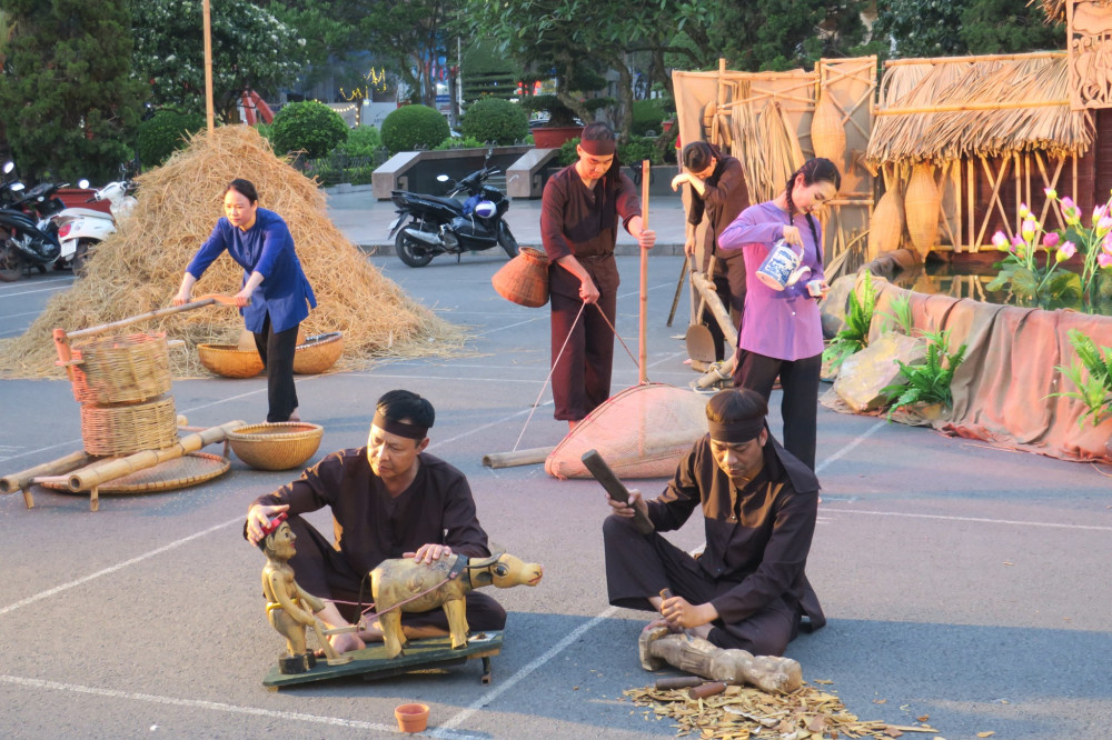 Trong nền nhạc hiện đại và hiệu ứng của ánh sáng, cuộc sống đời thường rất đỗi thân quen của người nông dân được khắc họa đầy vất vả, lo toan nhưng luôn đầy ắp niềm vui, tiếng cười. Tâm hồn, tính cách mộc mạc ấy hiện lên qua sự xuất hiện của các diễn viên trong vai những nghệ nhân đục con rối bên cối xay thóc, cối giã gạo, các bà các chị áo nâu, đầu thắt khăn mỏ quạ tất tả đi chợ thổi cơm, ngồi dệt bên khung cửi, nhóm bà con nghỉ chân, cùng nhau trò chuyện rôm rả bên gốc cây đa đầu làng sau buổi gặt về, những lão nông rít điếu cày, những ông lão đánh cá, câu ếch…