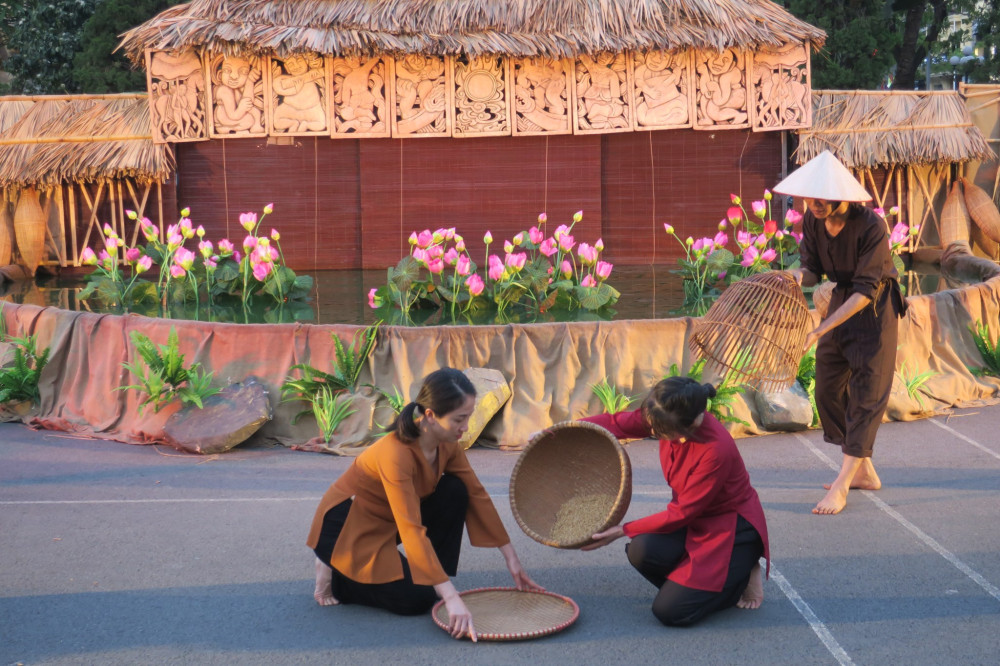 Nghệ thuật sắp đặt được thực hiện xung quanh sân khấu nước, dẫn dắt người xem tới những hình ảnh giản dị, chân thực và giàu cảm xúc về cảnh lao động, sinh hoạt truyền thống của dân đất Việt. Một khung cảnh điển hình của làng quê Việt Nam hiện ra trước mắt khán giả với những đụn thóc, bãi sân phơi đầy rơm, vài chiếc chõng tre, những chiếc chum nước bên giếng khơi…