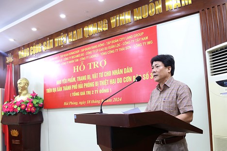 Thiếu tướng Trần Vinh Ngọc, Phó Chính ủy Quân khu 7 chia sẻ thiệt hại của Nhân dân thành phố do Bão số 3 gây ra. Cán bộ, chiến sĩ Quân khu 7 và các doanh nghiệp đóng góp nhu yếu phẩm, trang thiết bị, vật tư để hỗ trợ Nhân dân thành phố sớm khắc phục thiệt hại do Bão số 3. Đây là tấm lòng của cán bộ, chiến sĩ và doanh nghiệp trên địa bàn Quân khu 7 chia sẻ cùng thành phố Hải Phòng khắc phục hậu quả Bão số 3. Đồng chí mong thành phố lãnh đạo, chỉ đạo sớm khắc phục thiệt hại để Nhân dân thành phố ổn định cuộc sống.