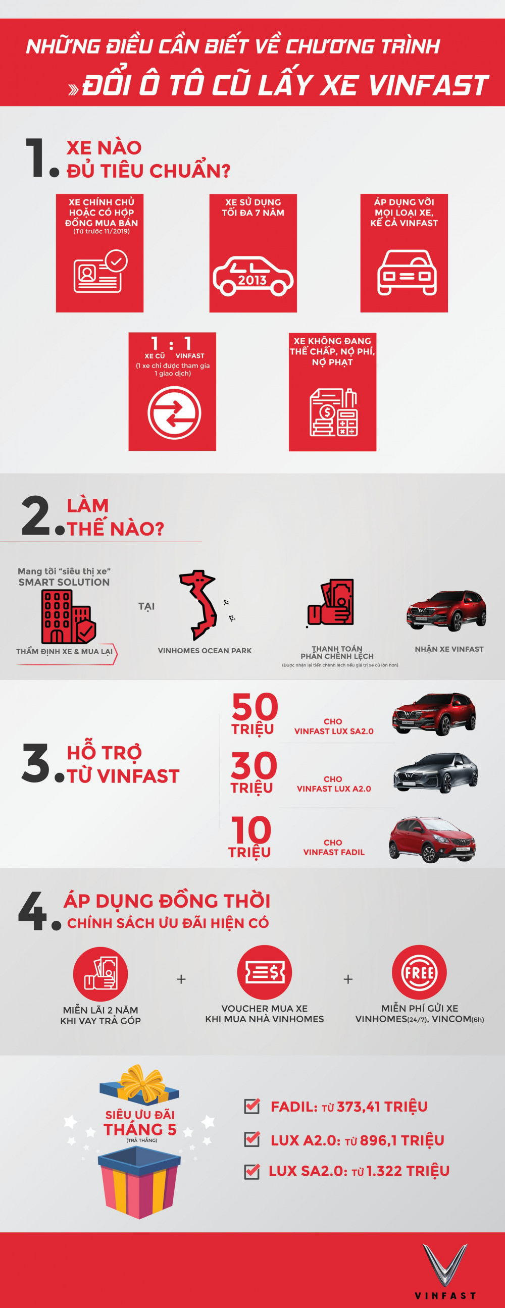 Chương trình “Đổi cũ lấy mới” được triển khai từ ngày 8/5/2020, áp dụng với tất cả các dòng ô tô lưu thông trên thị trường chưa quá 7 năm. Khách hàng có thể đến siêu thị xe Smart Solution tại Khu đô thị Vinhomes Ocean Park (Hà Nội) để tham gia chương trình. Khách hàng có thể tham khảo thông tin trên website www.vinfast.vn hoặc liên hệ hotline 1900.23.23.89 để được hỗ trợ.