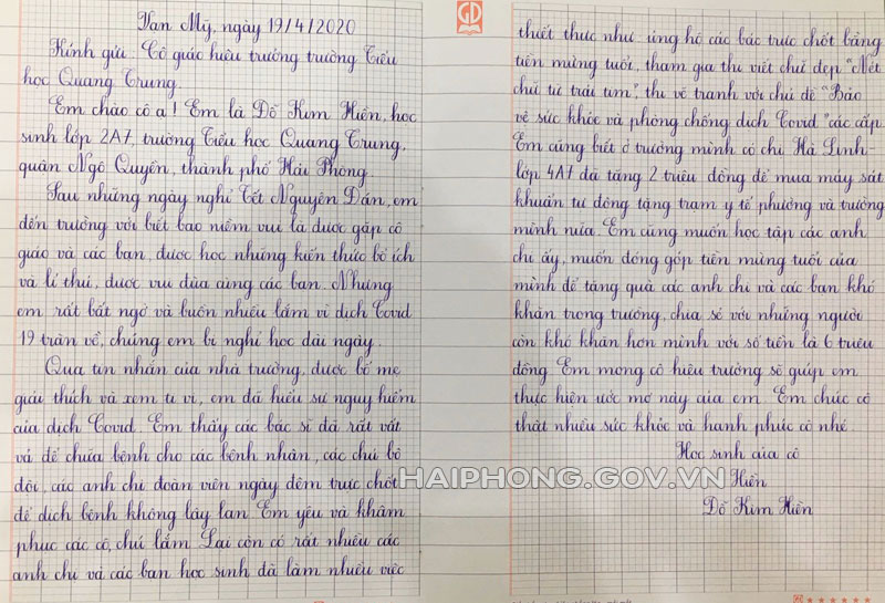 Em Hiền chia sẻ trong thư: Qua tin nhắn của nhà trường, được bố mẹ giải thích và xem tivi, em đã hiểu sự nguy hiểm của dịch COVID-19. Em thấy các bác sĩ đã rất vất vả để chữa bệnh cho các bệnh nhân, các chú bộ đội, các anh chị đoàn viên ngày đêm trực chốt để dịch bệnh không lây lan. Em yêu và khâm phục các cô chú lắm. Lại còn có rất nhiều các anh chị và các bạn học sinh đã làm nhiều việc thiết thực như ủng hộ các bác trực chốt bằng tiền mừng tuổi, tham gia thi viết chữ đẹp “Nét chữ từ trái tim”, thi vẽ tranh với chủ đề “Bảo vệ sức khỏe và phòng, chống dịch COVID-19” các cấp.