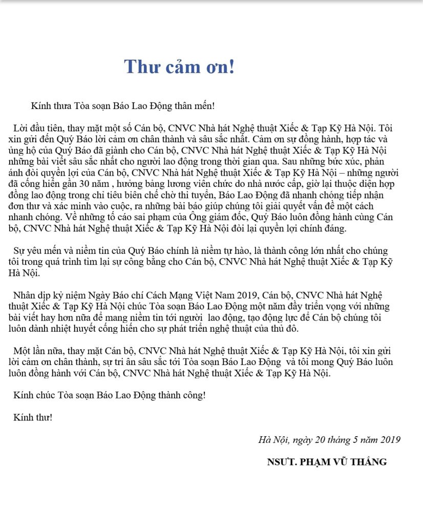 Ngày 31.1.2019, Sở Văn hóa và Thể thao TP.Hà Nội đã công bố kết luận nội dung tố cáo, trong đó chỉ rõ giám đốc nhà hát có nhiều thiếu sót, vi phạm và yêu cầu phải có các biện pháp khắc phục hậu quả, xem xét trách nhiệm. Cảm kích trước sự vào cuộc kịp thời và nói lên tiếng nói chính đáng của người lao động, mới đây, NSƯT Phạm Vũ Thắng đã thay mặt một số cán bộ, CNVC Nhà hát Nghệ thuật Xiếc và Tạp kỹ Hà Nội gửi thư cảm ơn Báo Lao Động vì đã đồng hành, hợp tác và ủng hộ cán bộ, CNVC nhà hát bằng những bài viết sâu sắc trong thời gian qua.