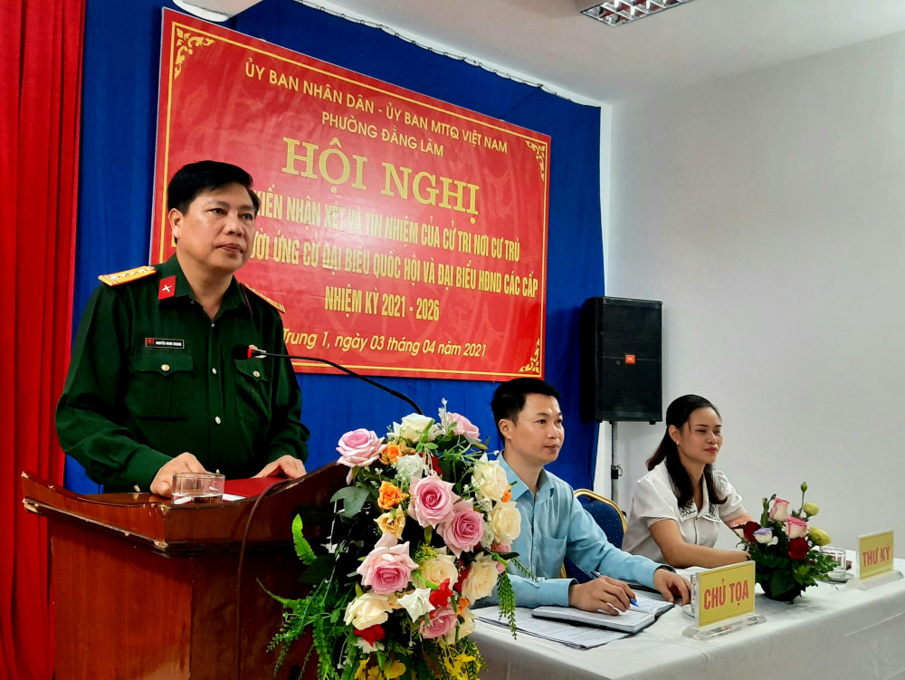 Thực hiện Luật Bầu cử đại biểu Quốc hội (ĐBQH) và đại biểu HĐND, các nghị quyết, hướng dẫn của Quốc hội, Mặt trận Tổ quốc (MTTQ) Việt Nam, sáng 3/4, Ủy ban MTTQ Việt Nam phường Đằng Lâm (quận Hải An) đã phối hợp với UBND phường Đằng Lâm tổ chức Hội nghị lấy ý kiến nhận xét và tín nhiệm của cử tri nơi cư trú đối với đồng chí Đại tá Nguyễn Minh Quang, Ủy viên Ban Thường vụ Thành ủy, Chỉ huy trưởng Bộ Chỉ huy Quân sự thành phố Hải Phòng, người ứng cử ĐBQH khóa XV và 6 đại biểu ứng cử HĐND các cấp.