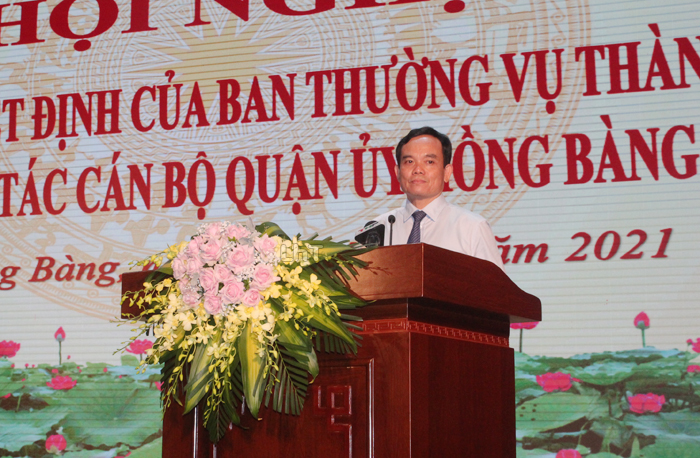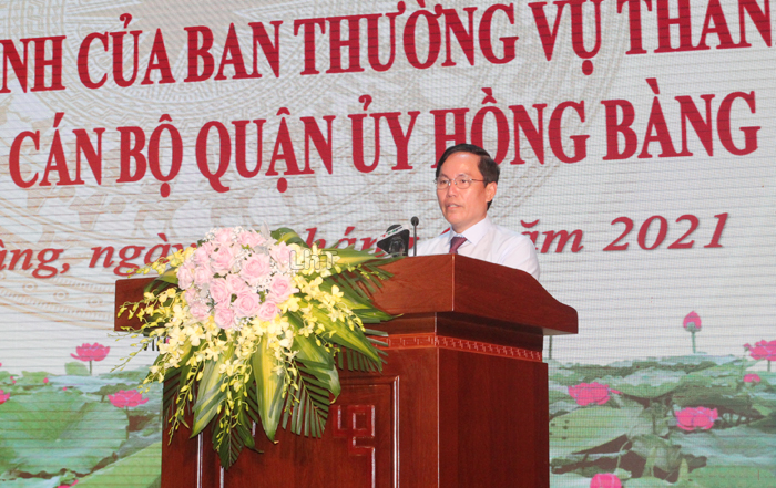 Trao các Quyết định và tặng hoa cho đồng chí Trần Quang Tuấn và đồng chí Lê Ngọc Trữ, đồng chí Trần Lưu Quang, Bí thư Thành ủy chúc mừng các đồng chí được nhận nhiệm vụ công tác mới. Đồng chí Bí thư Thành ủy nhấn mạnh, việc phân công đồng chí Lê Ngọc Trữ, Ủy viên Ban Thường vụ Thành ủy giữ chức vụ Bí thư Quận ủy Hồng Bàng thể hiện sự quan tâm của thành phố đối với quận Hồng Bàng. Đồng chí Lê Ngọc Trữ được đào tạo bài bản, đã giữ nhiều vị trí quan trọng, và vị trí nào cũng hoàn thành tốt các nhiệm vụ được giao. Đồng chí Bí thư Thành ủy đề nghị đồng chí Lê Ngọc Trữ trên cương vị công tác mới tiếp tục học hỏi, kế thừa những phong trào, kết quả đã đạt được, tiếp tục nỗ lực phấn đấu, rèn luyện cùng tập thể Ban Thường vụ, Ban Chấp hành Đảng bộ quận hoàn thành xuất sắc các nhiệm vụ được giao.