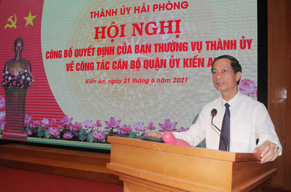 Sáng 21/6, Thường trực Thành ủy triệu tập Hội nghị công bố các quyết định của Ban Thường vụ Thành ủy về công tác cán bộ Quận ủy Kiến An. Đồng chí Đỗ Mạnh Hiến, Phó Bí thư Thường trực Thành ủy chủ trì Hội nghị.