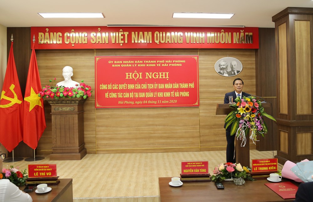 Tại Hội nghị, đại diện Sở Nội vụ đã công bố Quyết định của Chủ tịch UBND thành phố về việc nghỉ hưu đối với đồng chí Phạm Văn Mợi, nguyên Ủy viên Ban Thường vụ Thành ủy, Trưởng ban Ban Quản lý Khu kinh tế Hải Phòng từ 1/11/2020; Quyết định của UBND thành phố về việc tiếp nhận, điều động và bổ nhiệm chức vụ Trưởng ban Ban Quản lý Khu kinh tế Hải Phòng đối với đồng chí Lê Trung Kiên, Ủy viên Ban Thường vụ Thành ủy, nguyên Bí thư Quận ủy Lê Chân giữ chức vụ Trưởng ban Ban Quản lý Khu kinh tế Hải Phòng. Thời hạn bổ nhiệm 5 năm kể từ ngày 1/11/2020.
