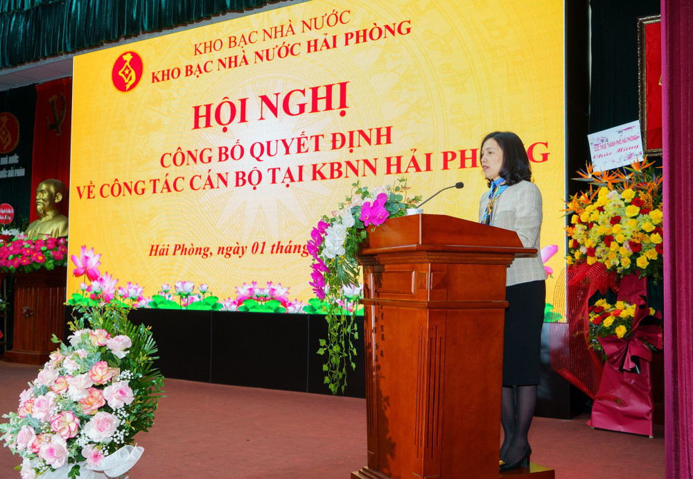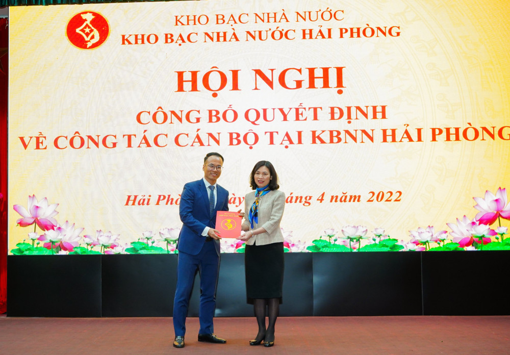 Tại hội nghị, đồng chí Đặng Thị Vân Anh, Vụ trưởng Vụ Tổ chức cán bộ Kho bạc Nhà nước thông báo Quyết định của Tổng Giám đốc Kho bạc Nhà nước về việc điều động, bổ nhiệm đồng chí Lê Thanh Phương, Giám đốc Kho bạc Nhà nước Hải Phòng giữ chức Giám đốc Kho bạc Nhà nước Hà Nam và công bố Quyết định số 1228/QĐ-KBNN ngày 22/3/2022 của Tổng Giám đốc Kho bạc Nhà nước về việc tiếp nhận và bổ nhiệm đồng chí Ngô Duy Hùng, Phó Chánh Văn phòng Bộ Tài chính giữ chức Giám đốc Kho bạc Nhà nước Hải Phòng.