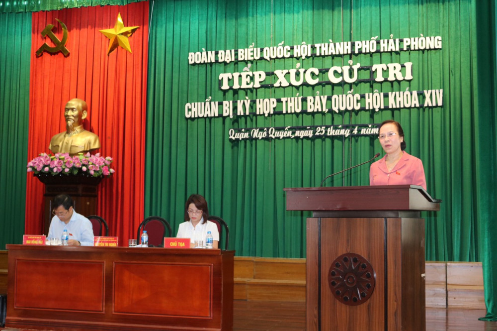 Đồng chí Nguyễn Thị Nghĩa, Phó Bí thư Thường trực Thành ủy, Trưởng Đoàn ĐBQH Hải Phòng phát biểu tại cuộc tiếp xúc cử tri quận Ngô Quyền